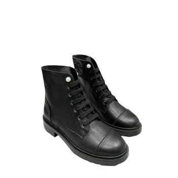 CHANEL BLACK LEATHER COMBAT BOOTS WITH PEARL DETAILING ON TOP $375.00Select options