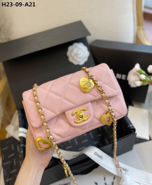 CHANEL FLAP BAG WITH HEART CC CHARM PINK 20CM