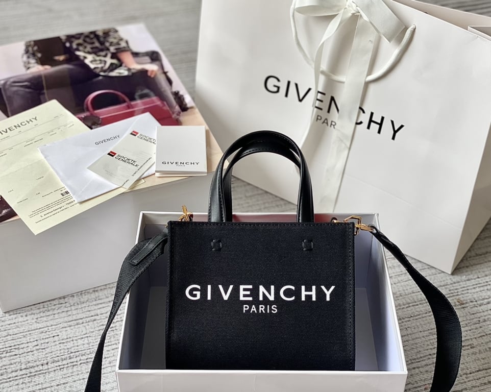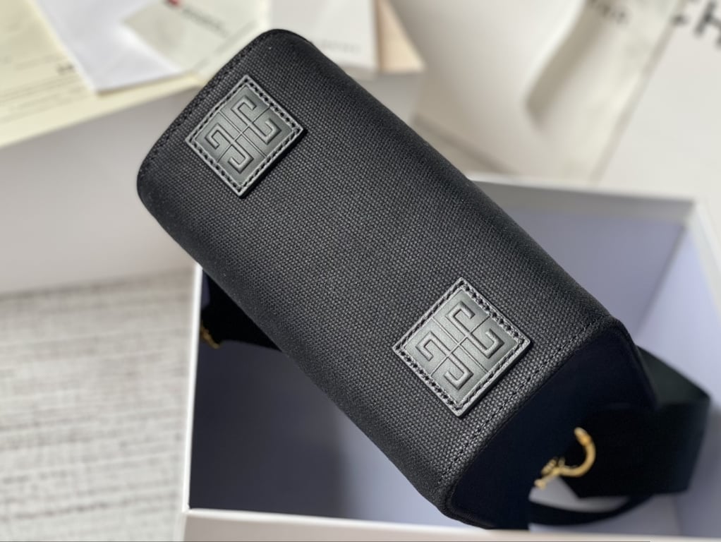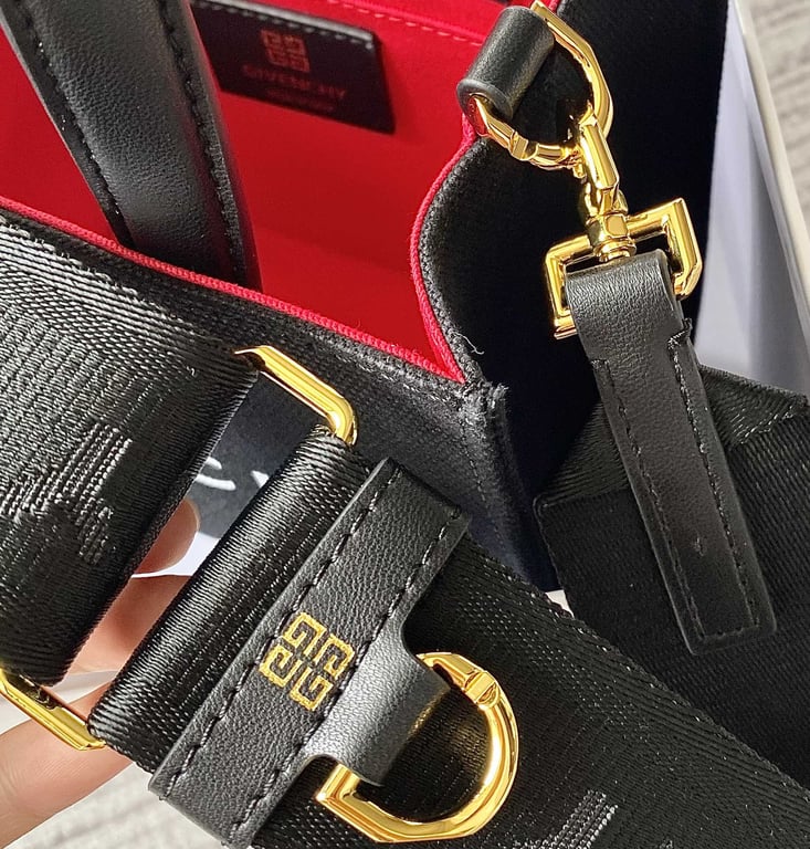 - Wide, removable canvas jacquard shoulder strap with GIVENCHY details and metal ring accents.