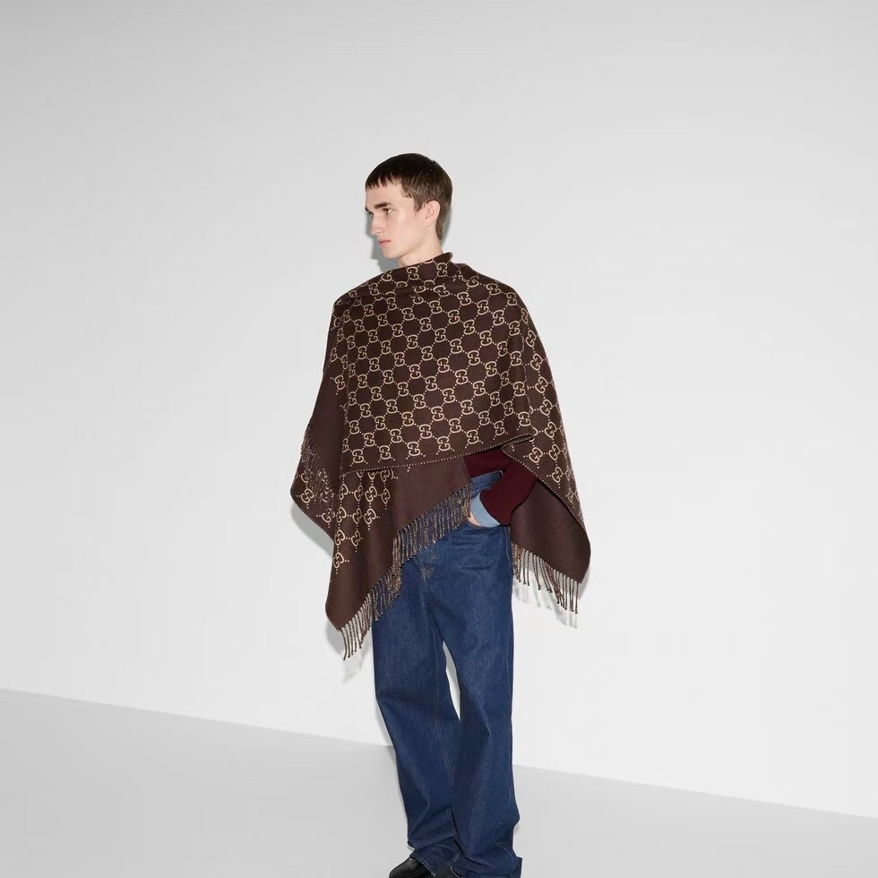 GUCCI GG WOOL JACQUARD CAPE BROWN AND BEIGE 140CM 817831 3G200 2579