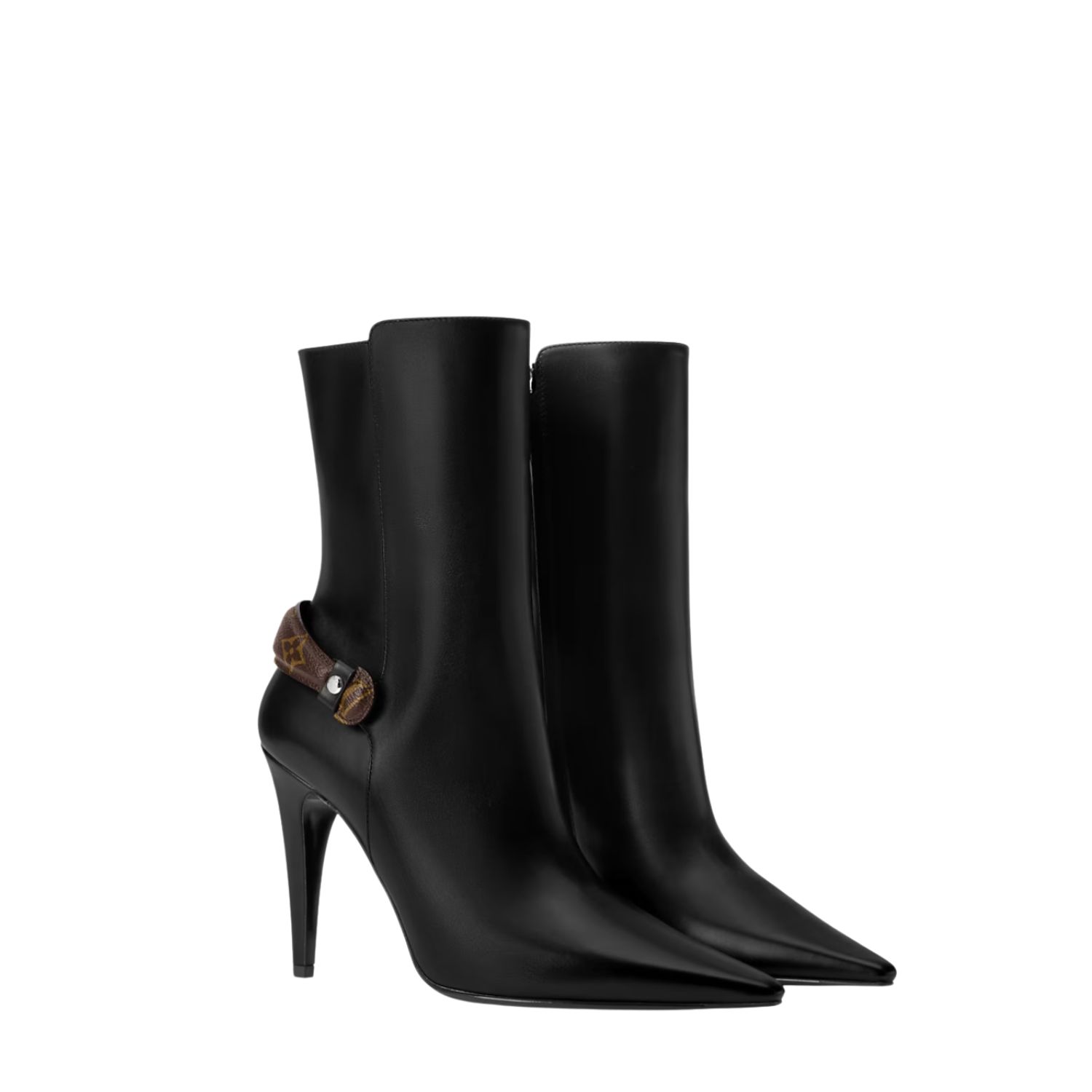 The Legacy ankle boot is characterized by its pointed toe and high stiletto heel, it is notable for the strap detail in Monogram canvas at the back, which references the handles of Louis Vuitton trunks.