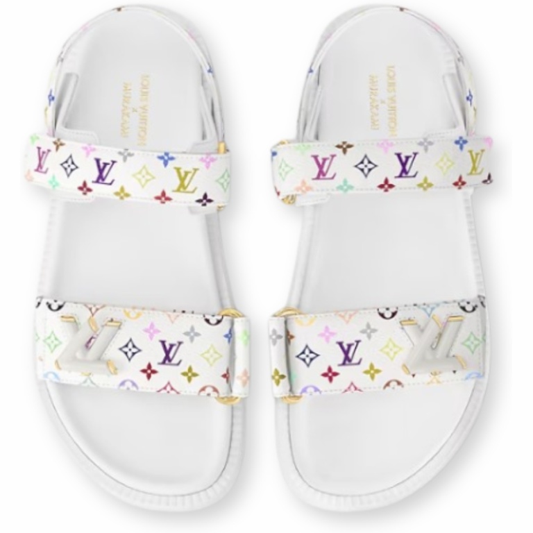 Striking signatures from the re-edition of the Louis Vuitton x Murakami collection reimagine the LV Sunset flat comfort sandal as a playful everyday statement. Crafted from coated canvas, the iconic Monogram motif is accented with bright rainbow tones inspired by the exuberant aesthetic of Japanese artist Takashi Murakami, while the front strap is embellished with chunky LV Initials with golden touches. Complete with an anatomic footbed and lightweight micro outsole for elevated comfort.