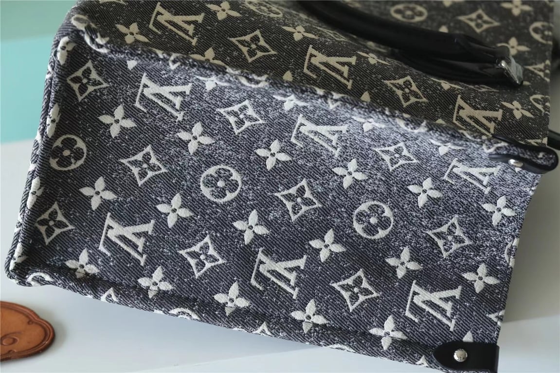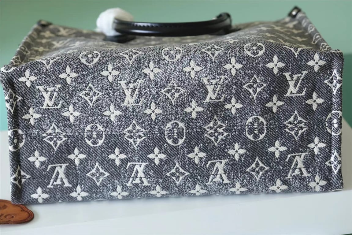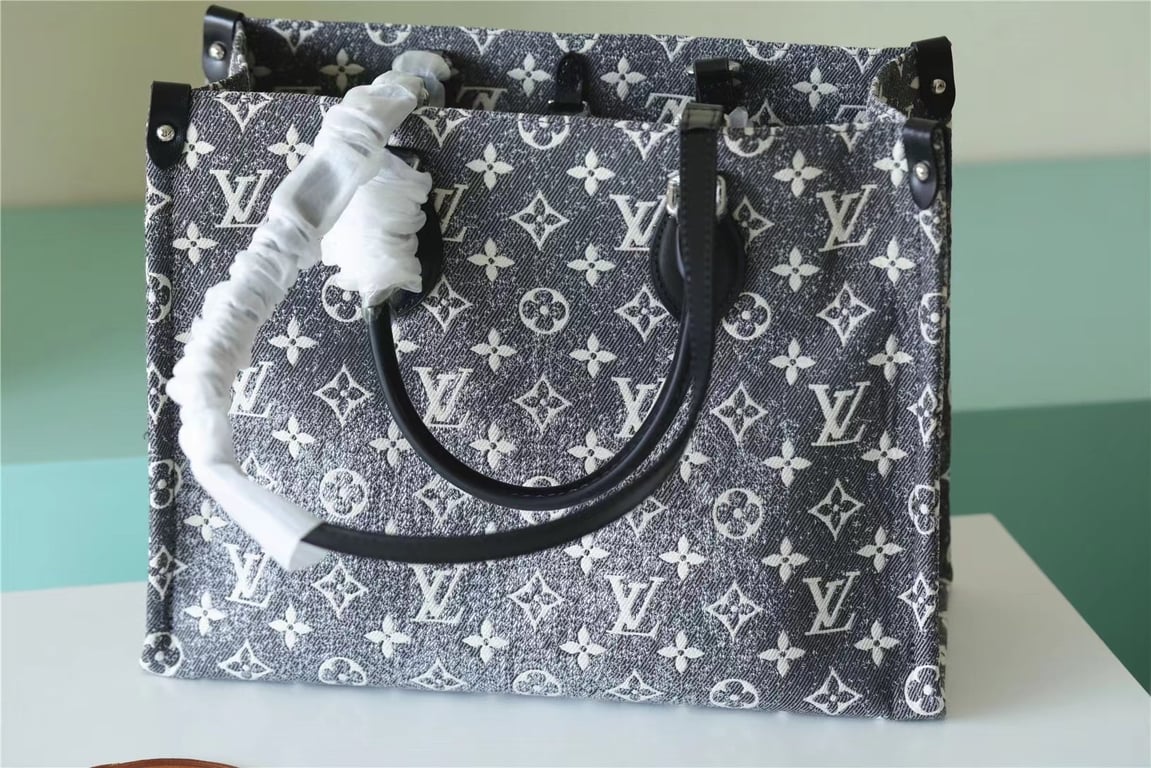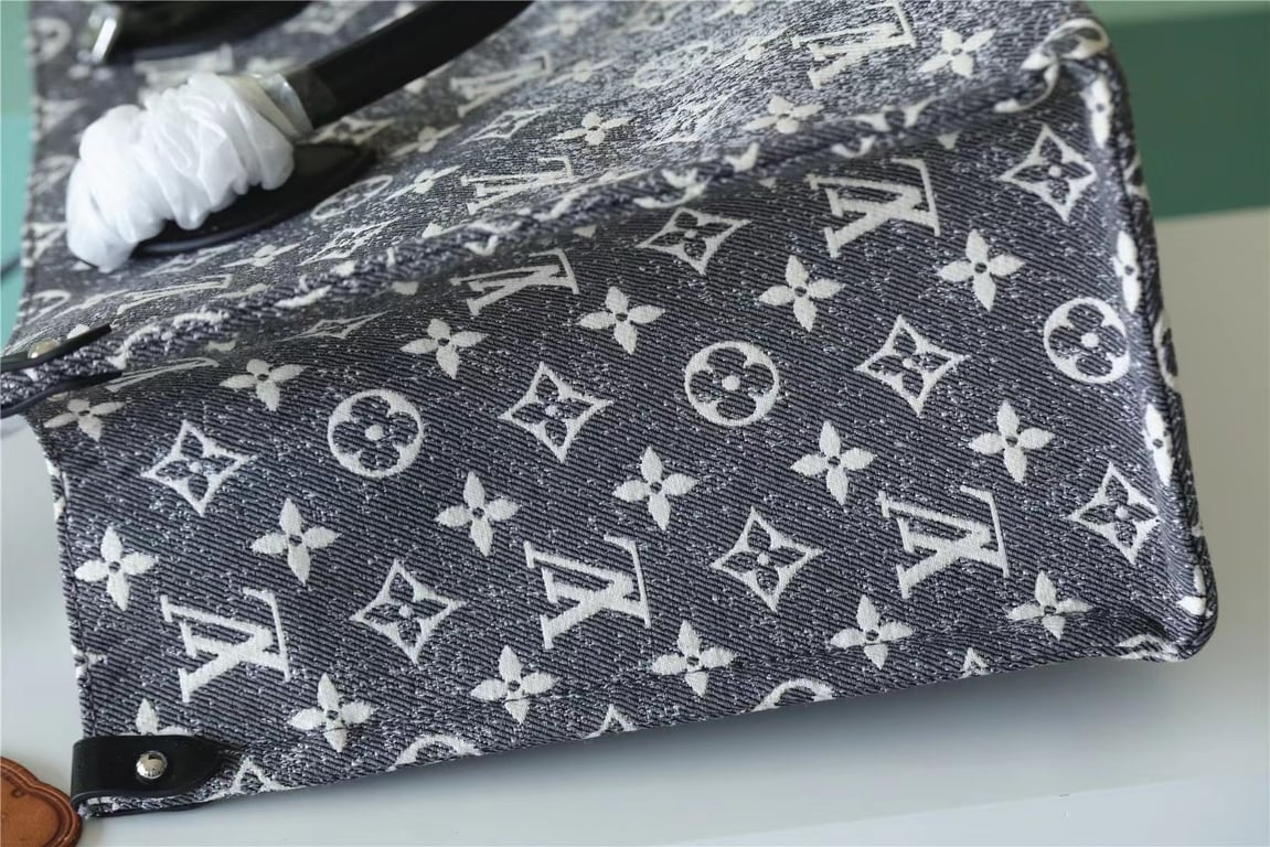 LOUIS VUITTON’S GRAY 13.8IN/35CM ONTHEGO MM MONOGRAM JACQUARD DENIM SHOUDER BAGS