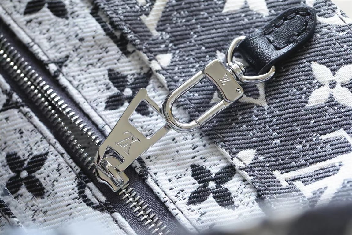 This fabric has a raw, stone-washed look with a reverse Monogram lining, black trim, and silver hardware.