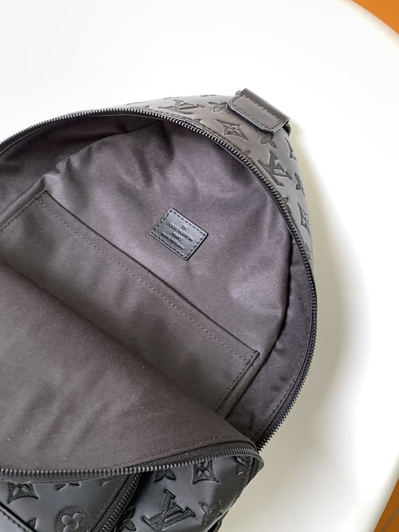 - Monogram Shadow in elegant black gives the Racer Slingbag a sporty-chic aura. Supple but durable calf is embossed with Louis Vuitton?s iconic Monogram pattern for a discreet but distinctive signature. Compact enough to sling comfortably over one shoulder, it still has plenty of room for all the everyday essentials perfect for the modern man on the go.