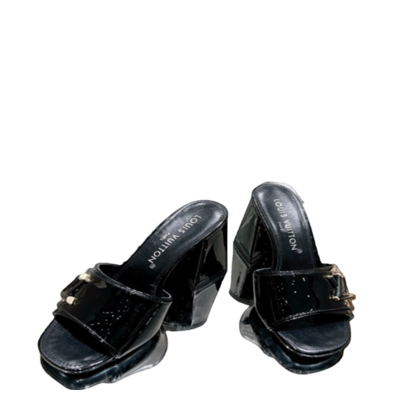 Metallic brings added glamour to the Shake mule, a modern style notable for its high block heel with a graphic V shape. The wide front strap is embellished with a jewel-like LV accessory, entirely covered in crystals, which references the iconic Twist handbag. An oversized Louis Vuitton signature is printed on the insole.