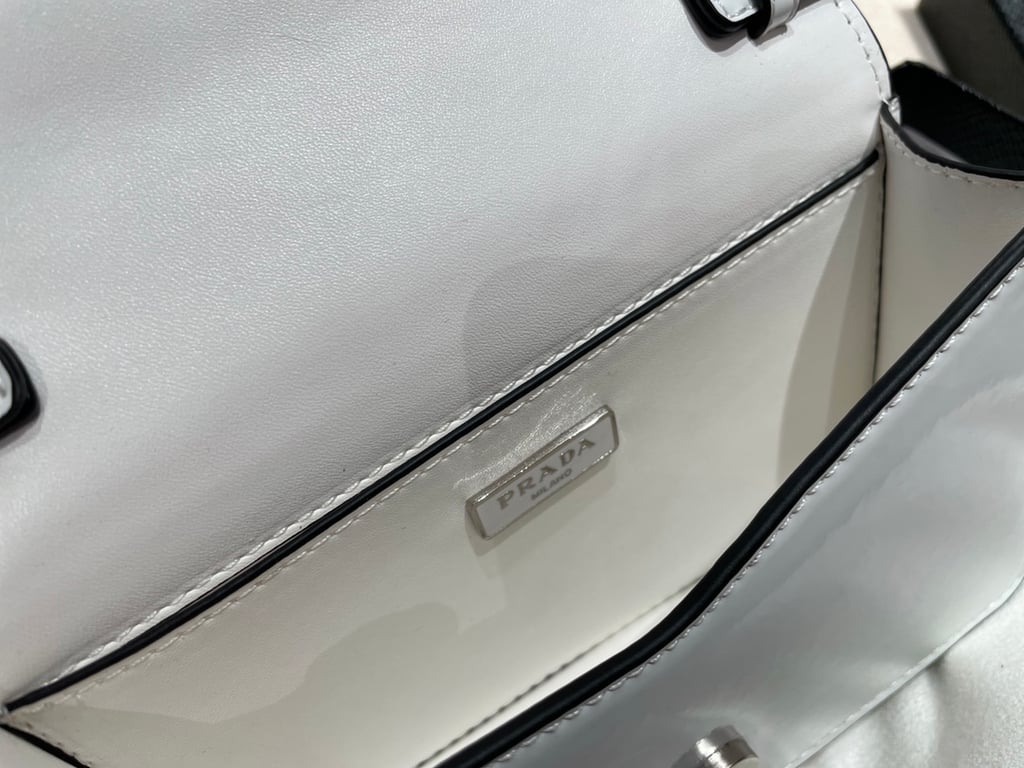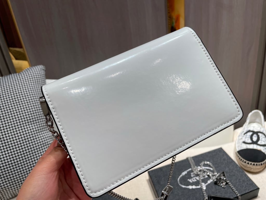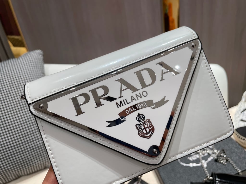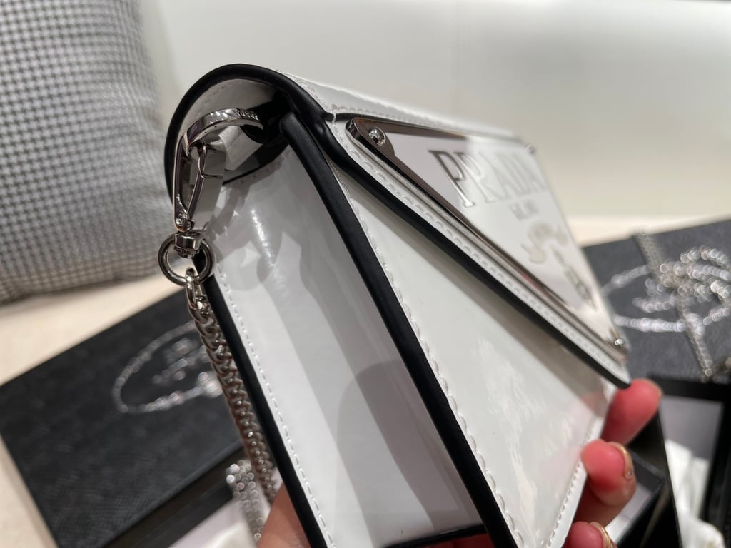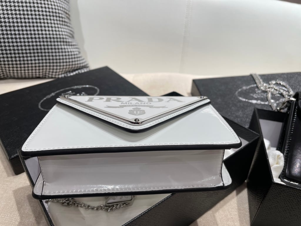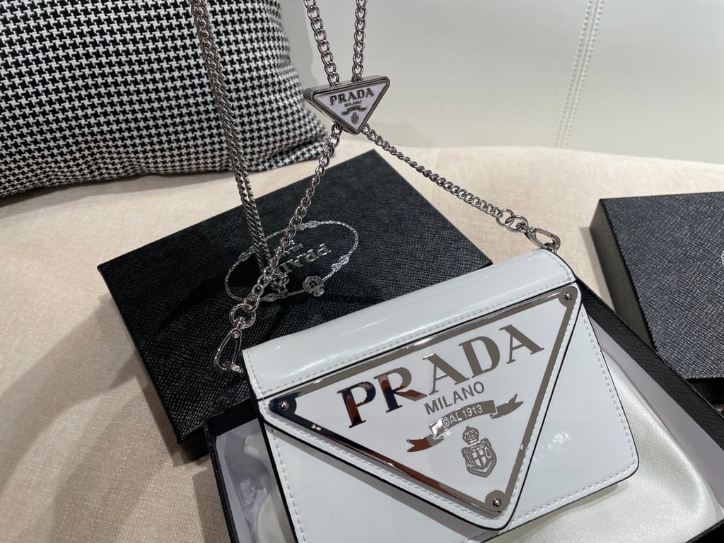 PRADA BRUSH LEATHER TRIANGLE LOGO CHAIN CLUTCH BAG WHITE 17CM