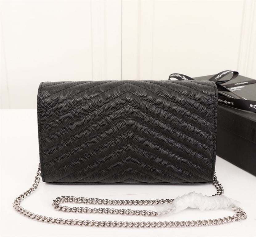 SAINT LAURENT CASSANDRE MATELASSE CHAIN WALLET IN GRAIN DE POUDRE EMBOSSED BLACK SILVER 22CM