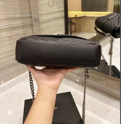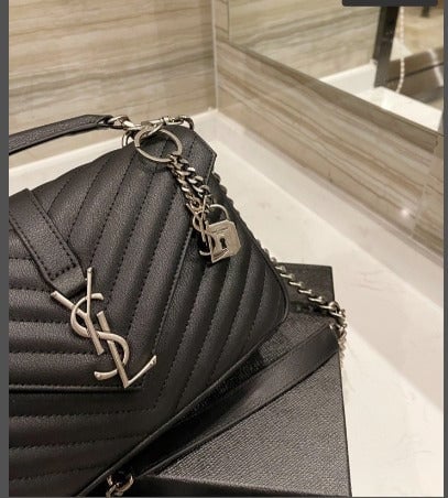SAINT LAURENT COLLEGE MEDIUM SILVER CHAIN IN QUILTED BLACK SILVER 24CM