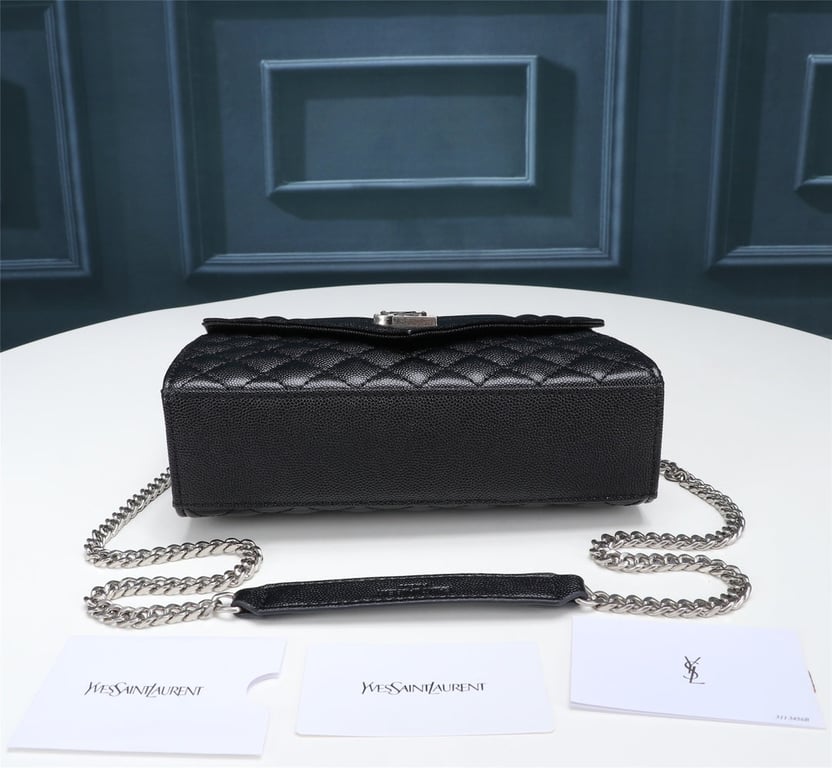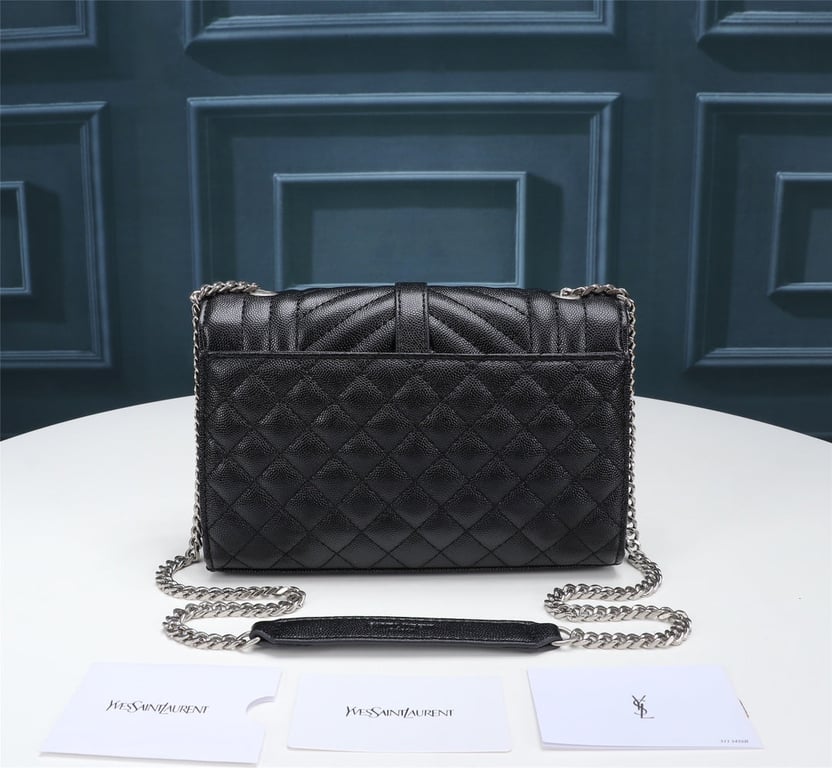 SAINT LAURENT’S ENVELOPE SMALL BAG IN MIX MATELASSE GRAIN DE POUDRE EMBOSSED BLACK SILVER 21CM