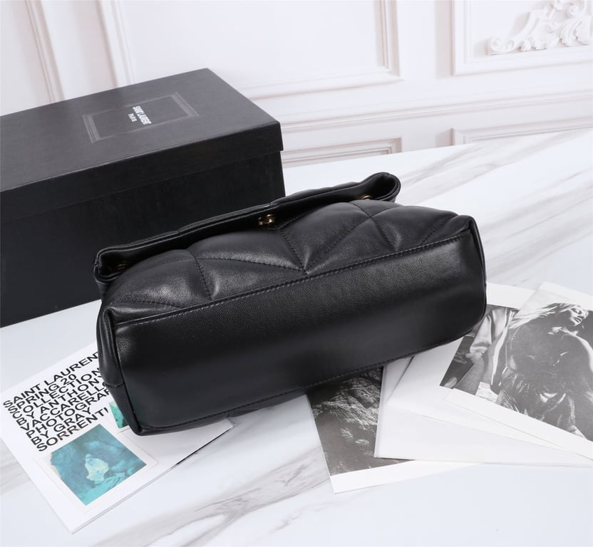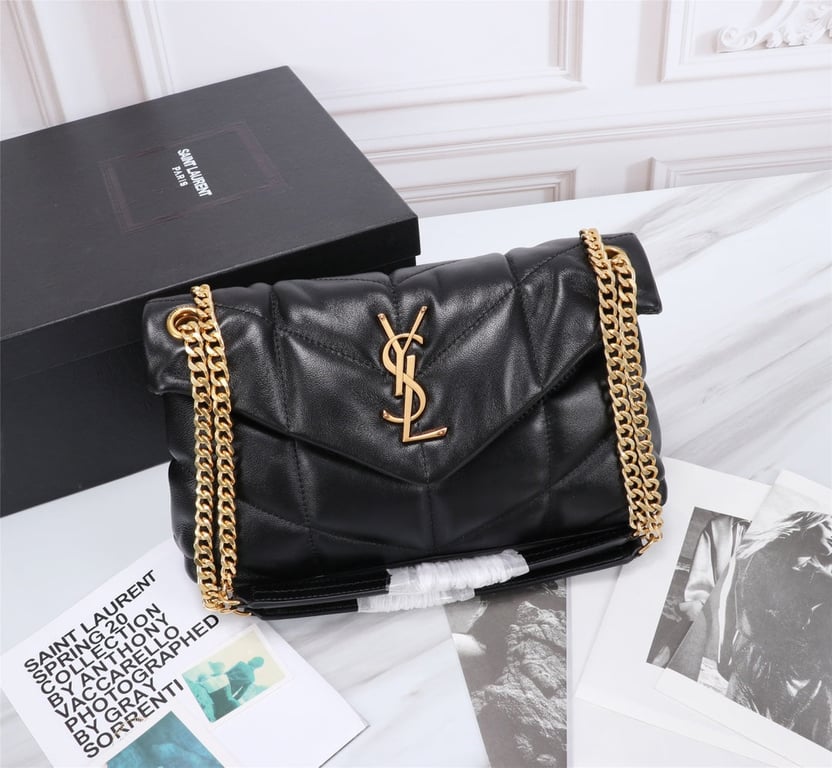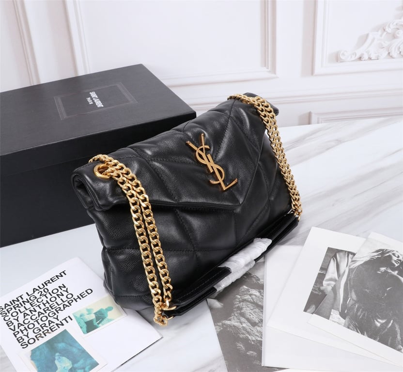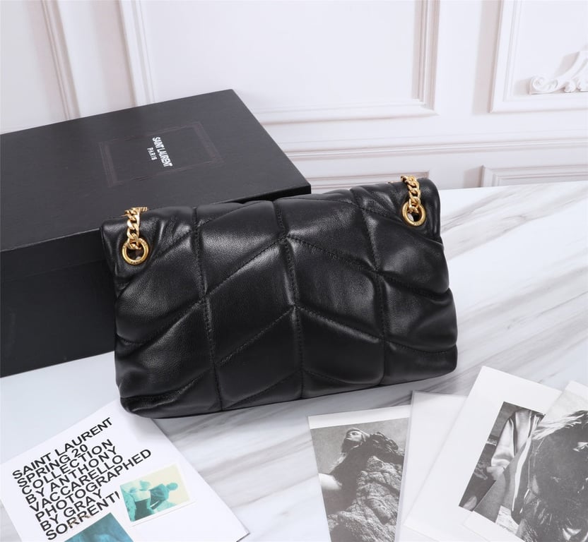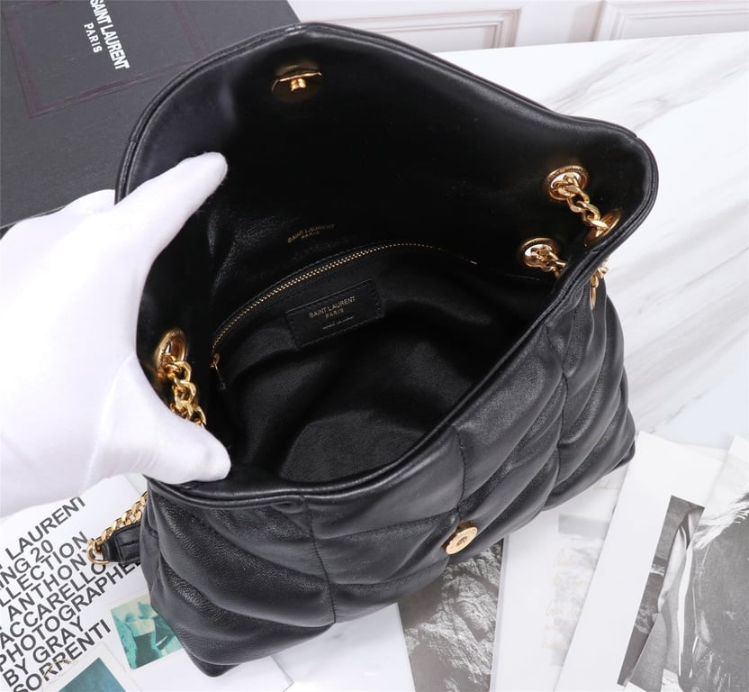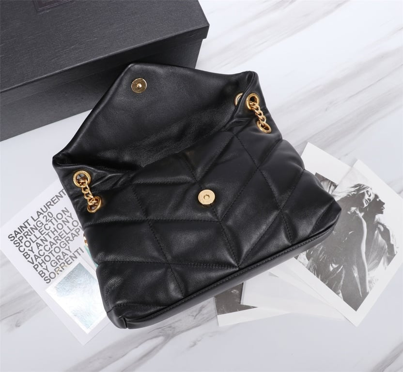 SAINT LAURENT’S PUFFER SMALL CHAIN BAG IN QUILTED LAMBSKIN BLACK GOLD